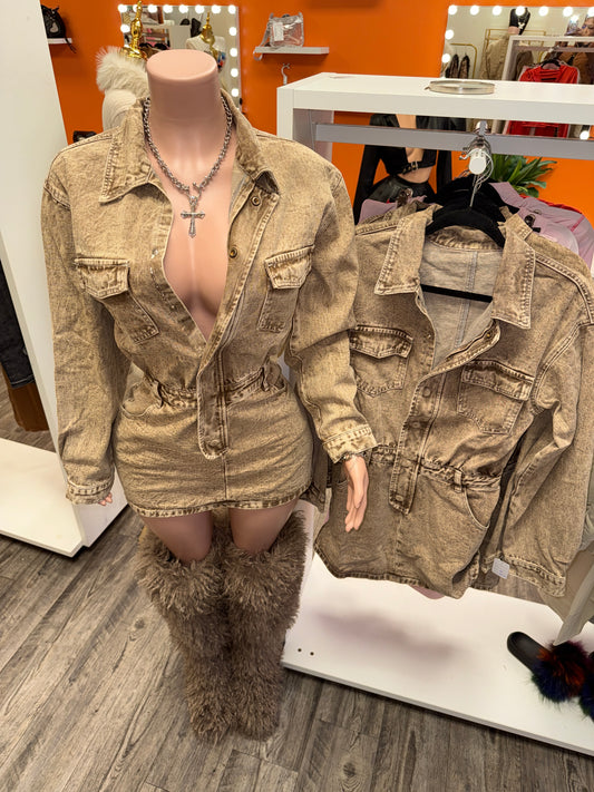Brown Denim Button-Up Long Sleeve Dress With Belt Loops