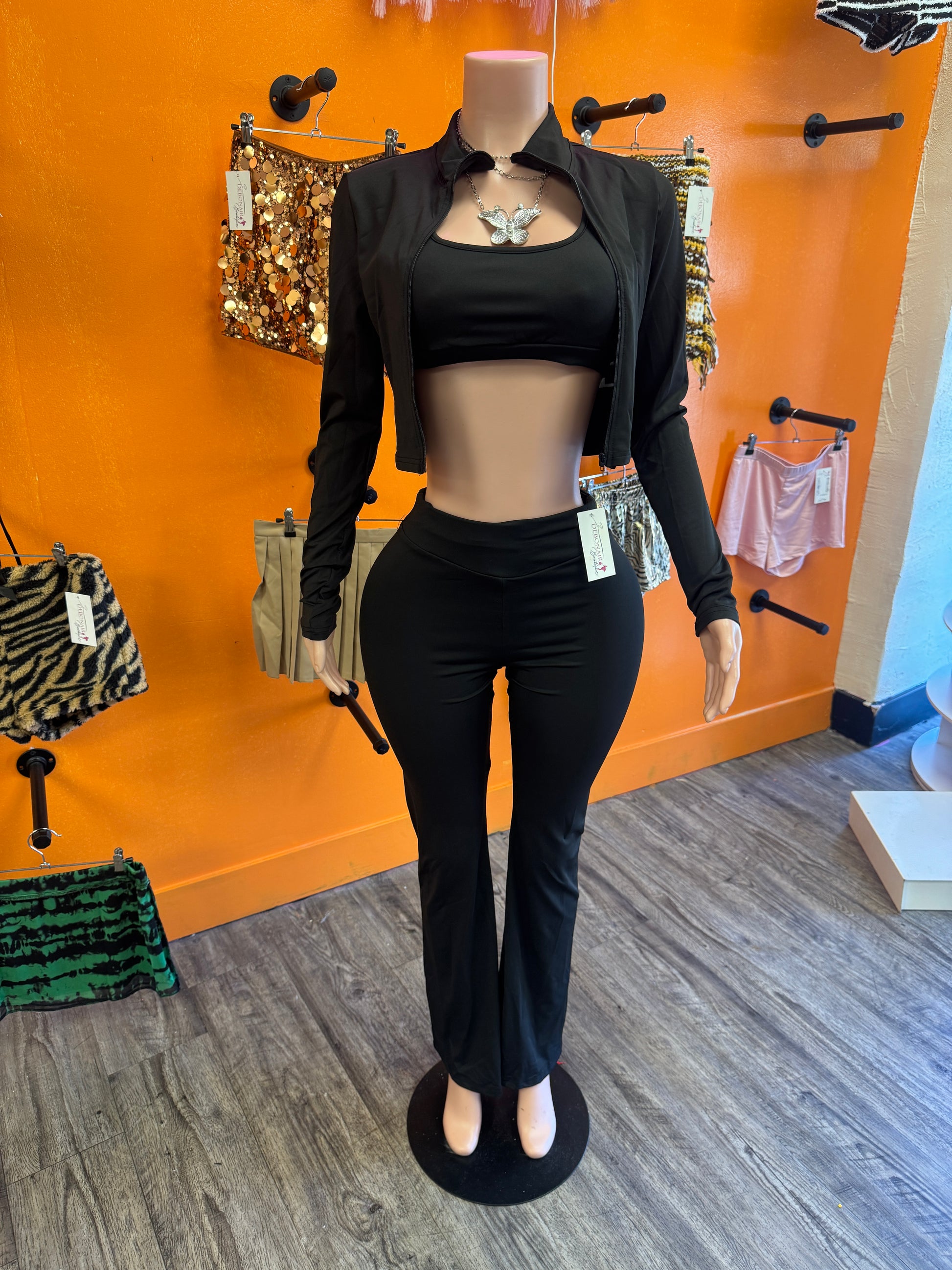 Super stretchy athletic 3 piece set includes jacket, top and flare pants… tall girl friendly
