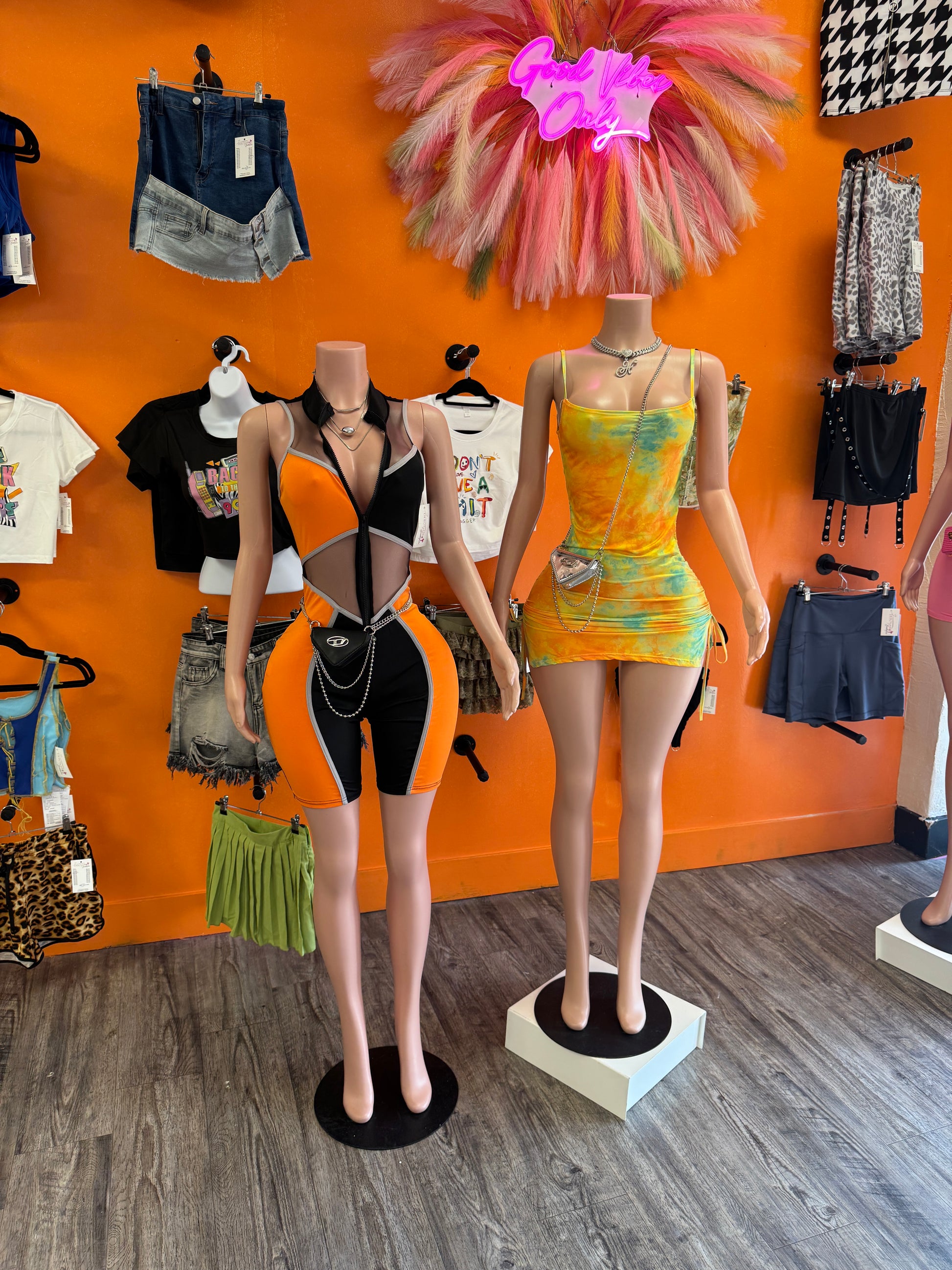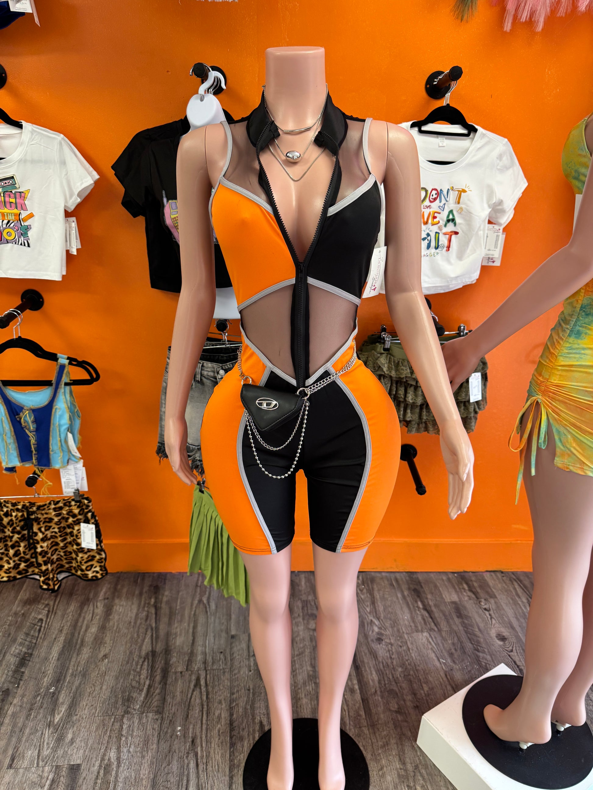 Orange and black color block mesh zip romper
