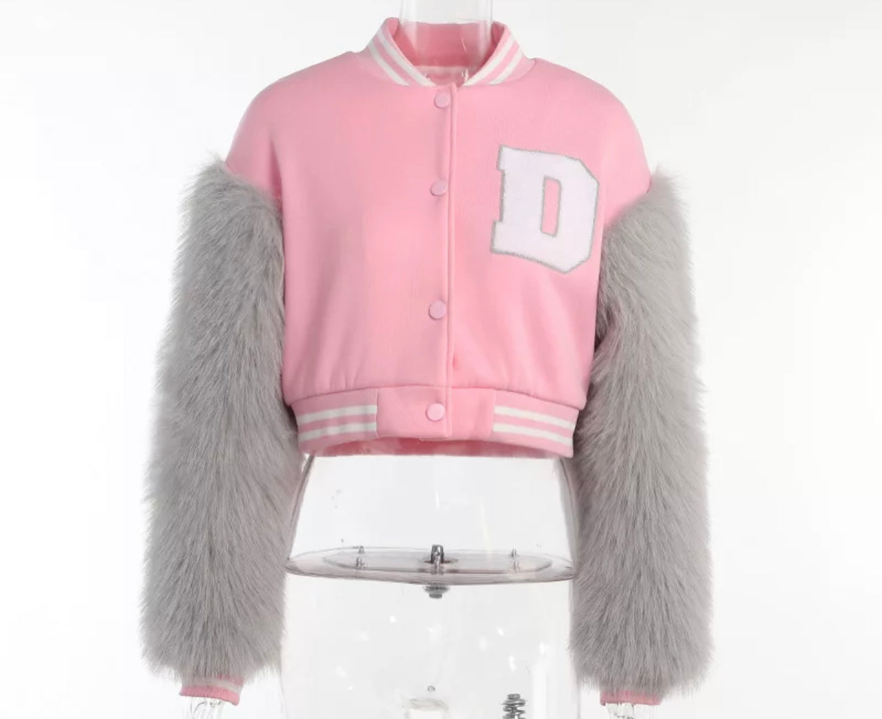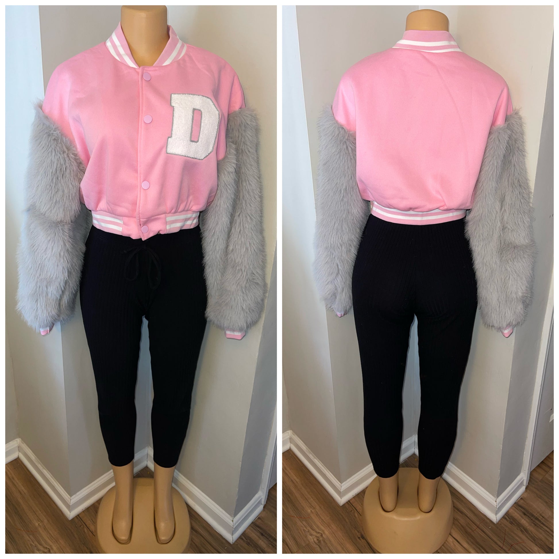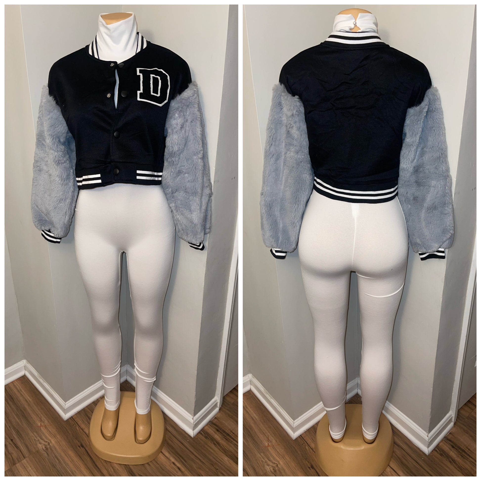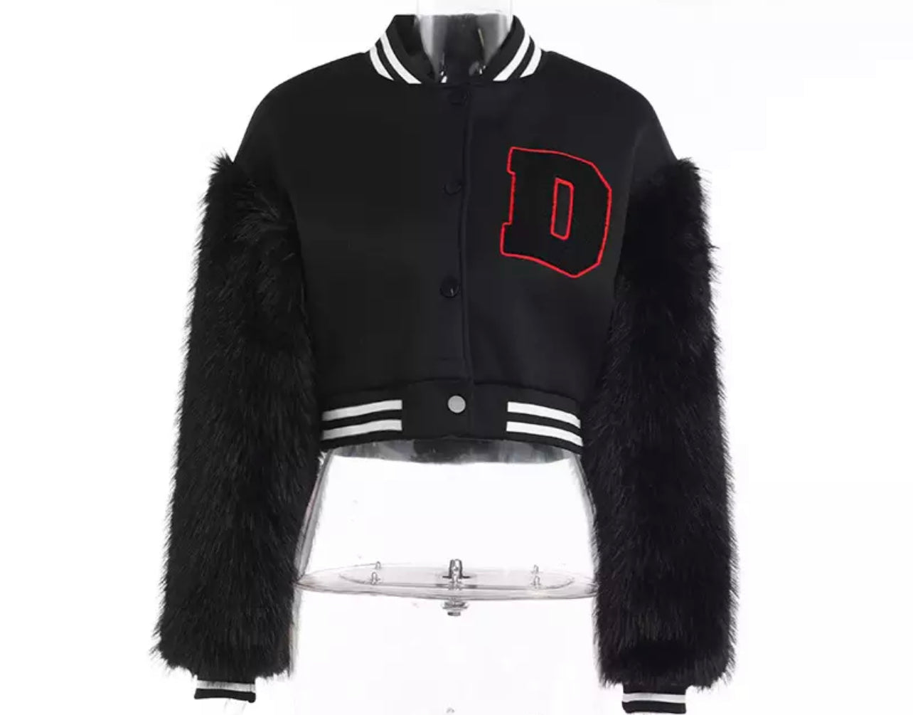 Varsity jacket with fur sleeves—
