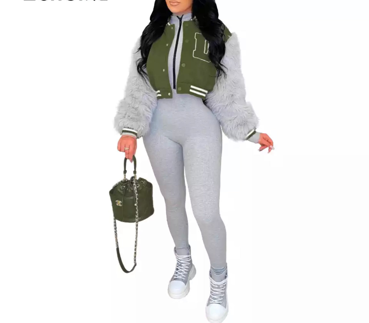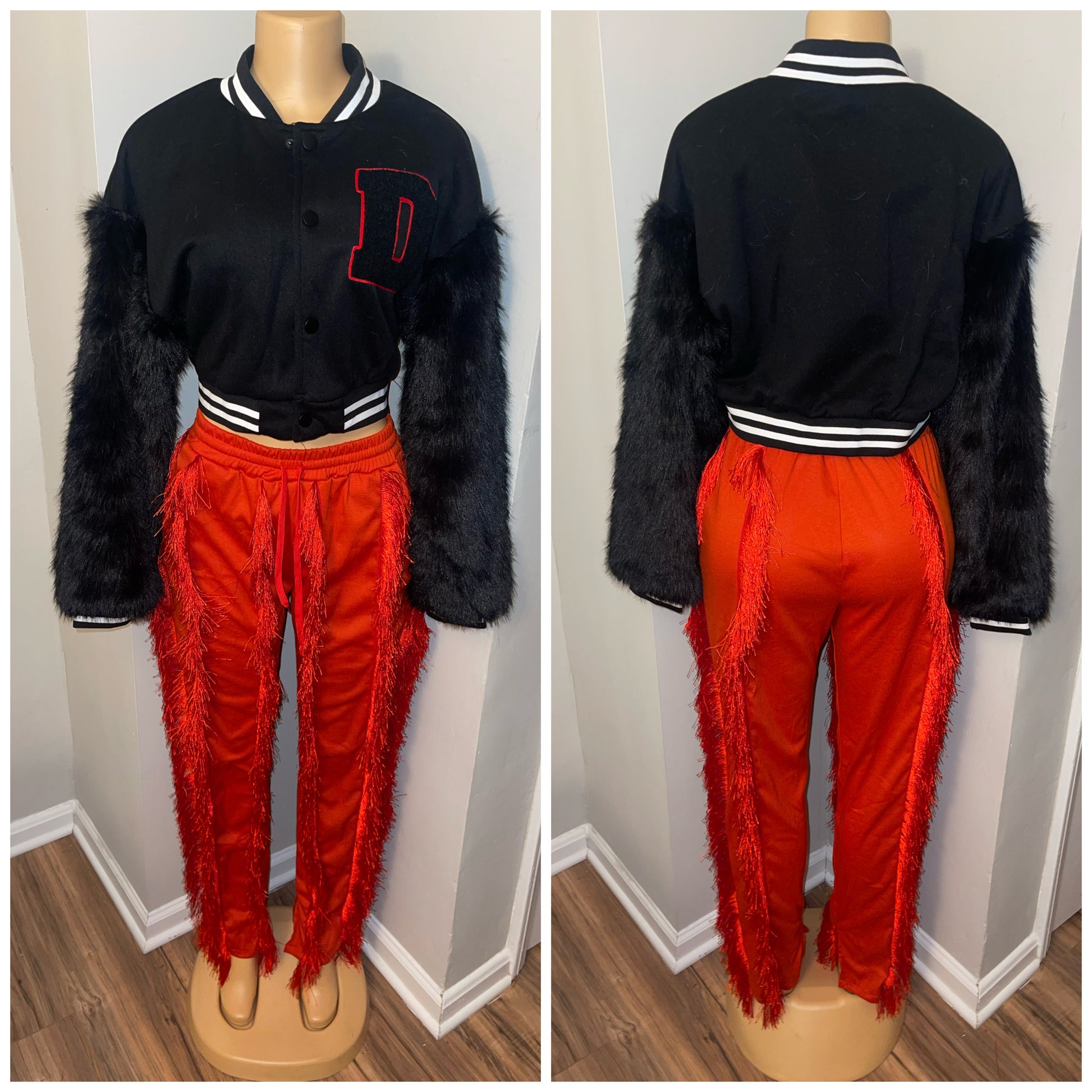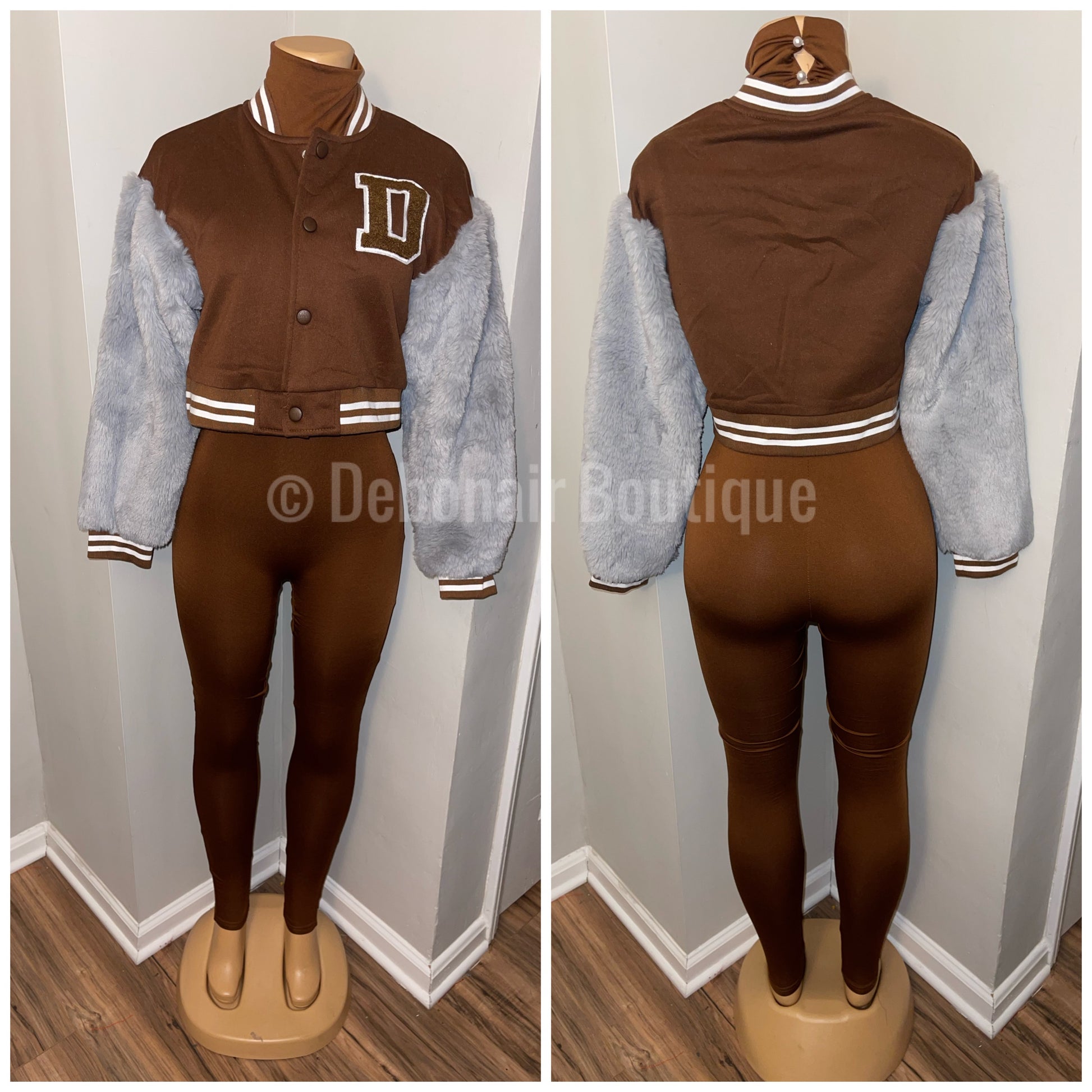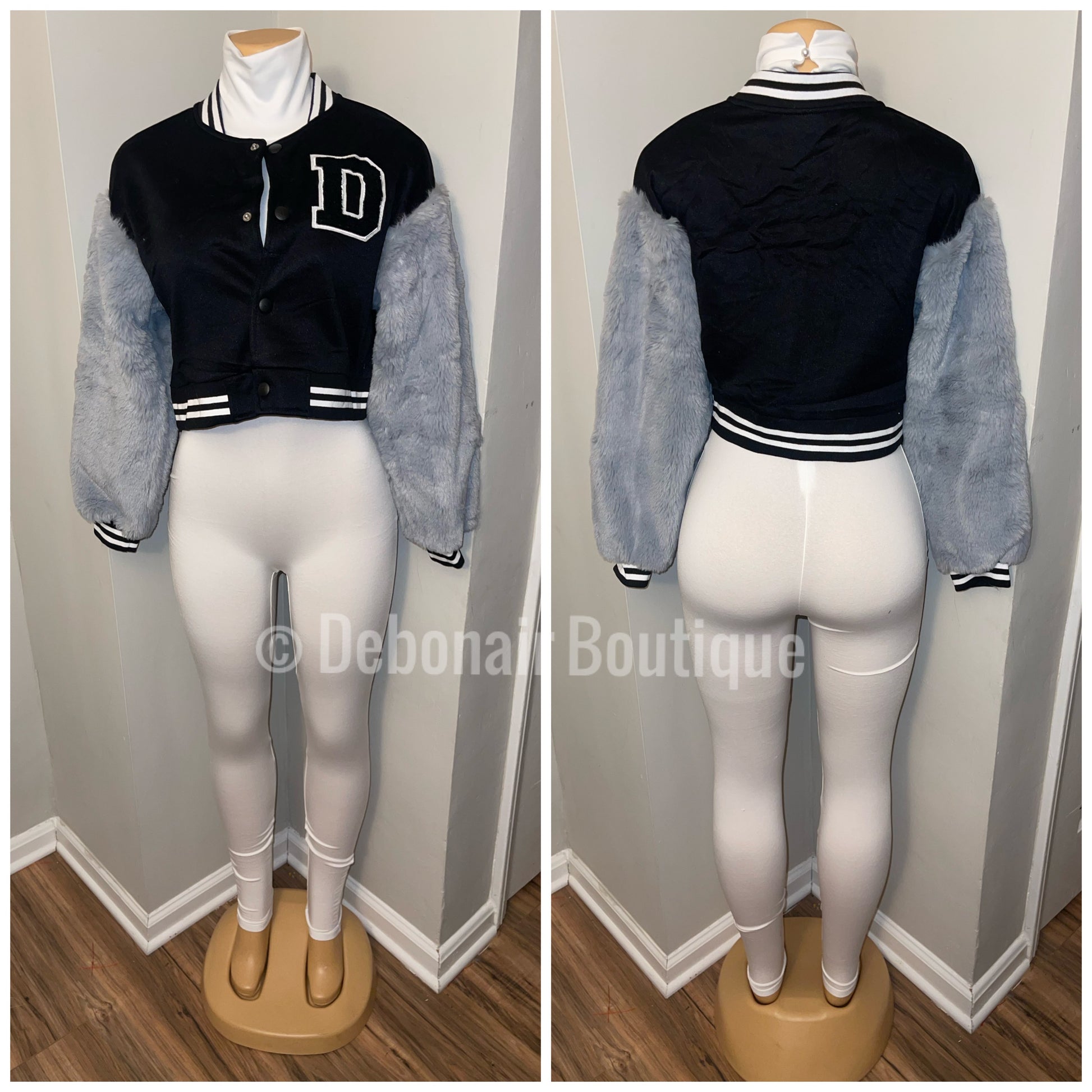 Varsity jacket with fur sleeves—