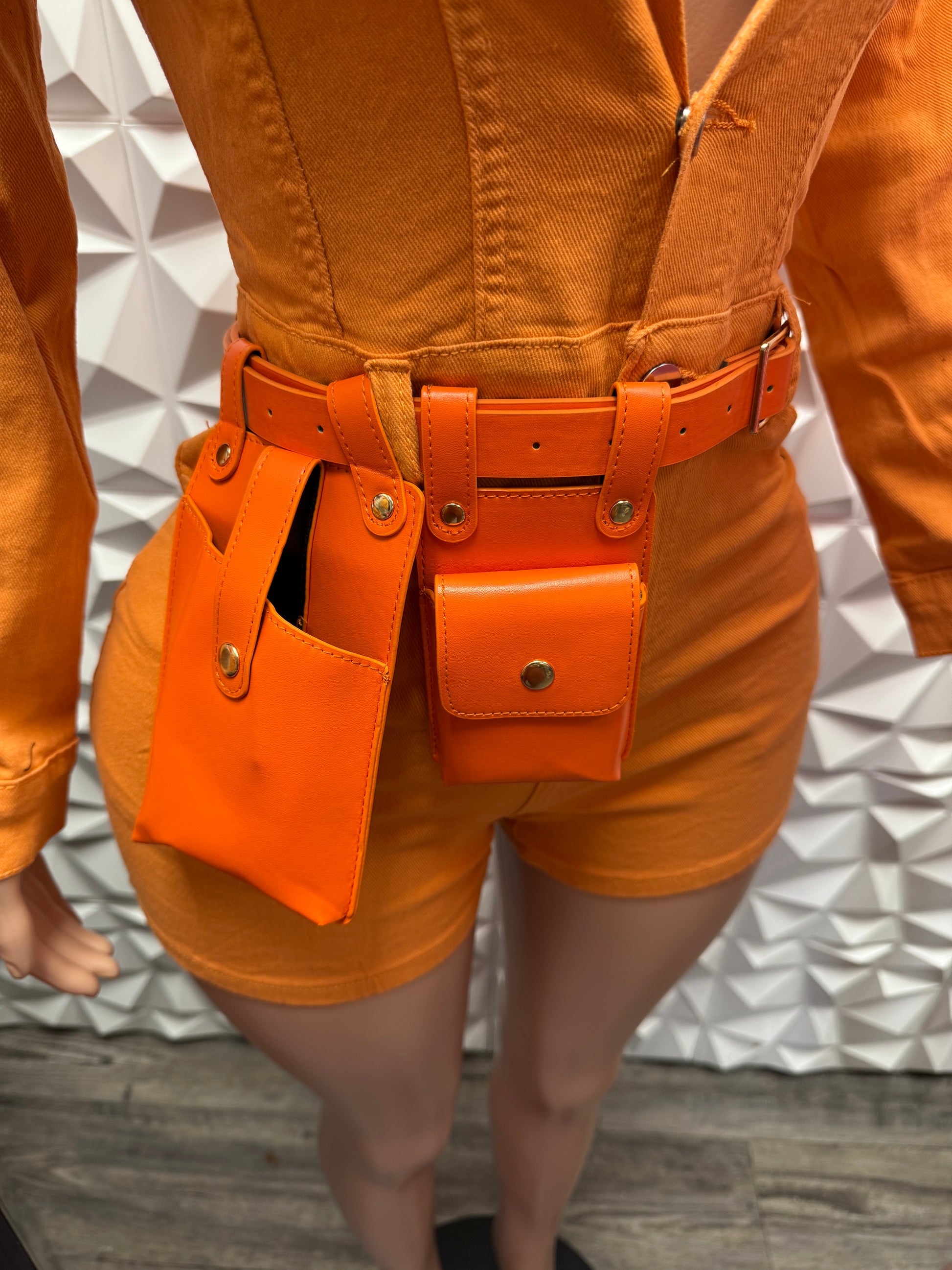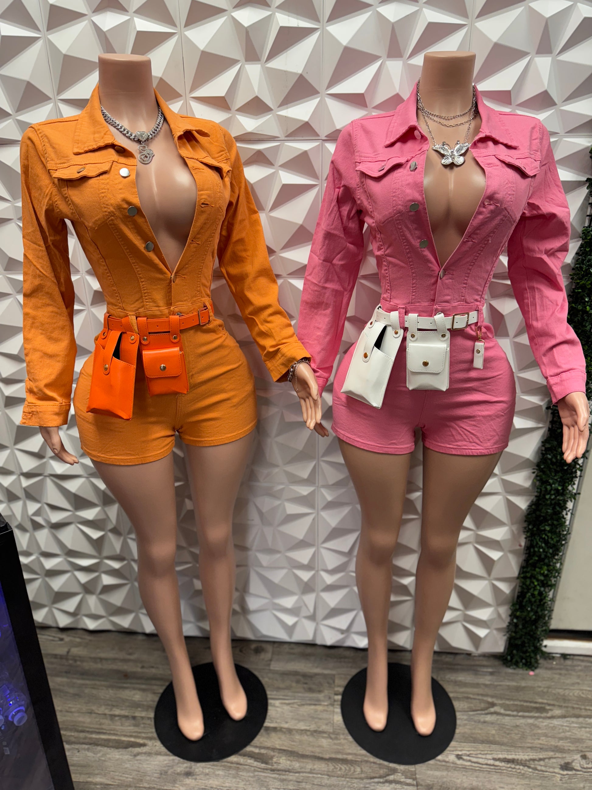 Long sleeve stretchy denim romper with buttons (belt not included, sold separately)