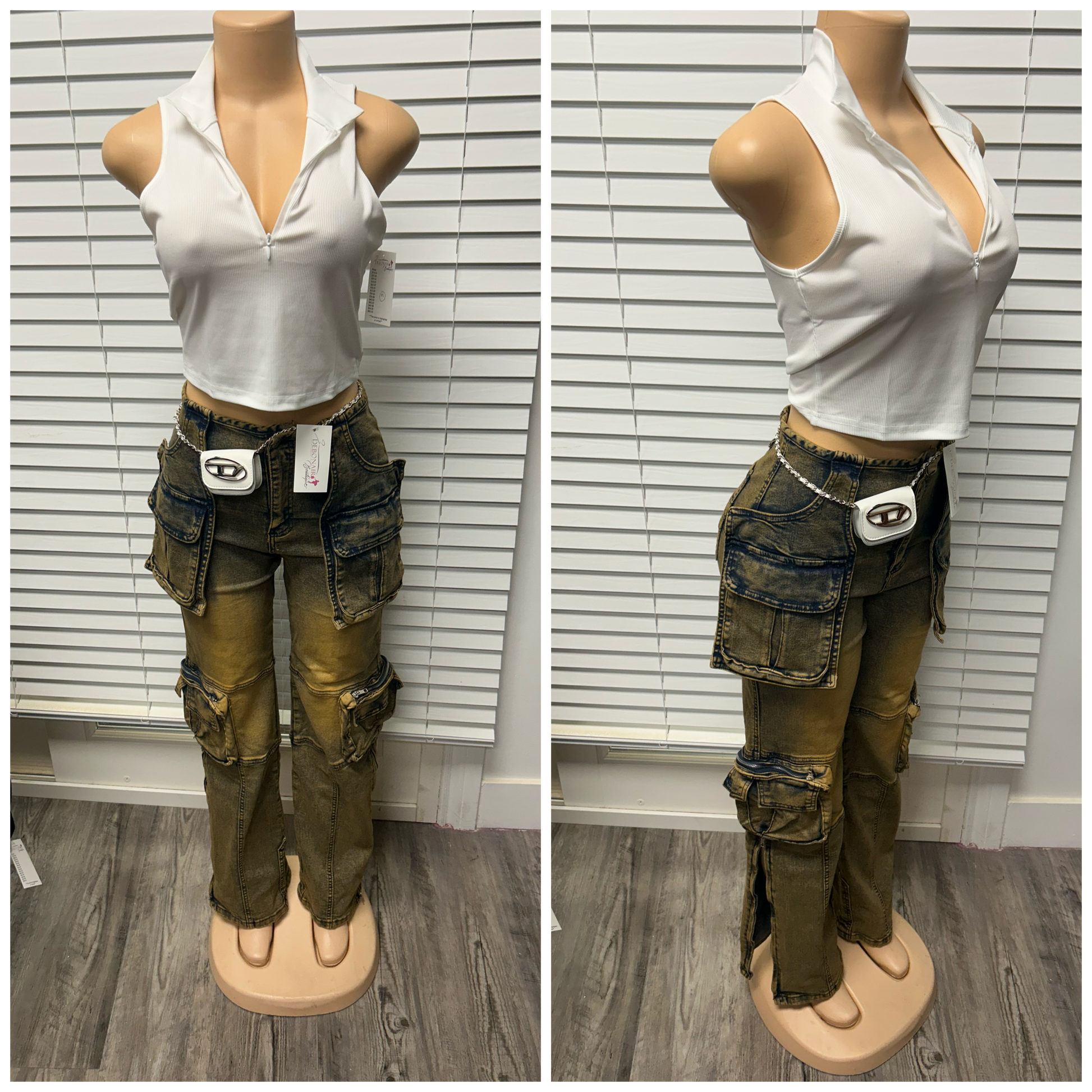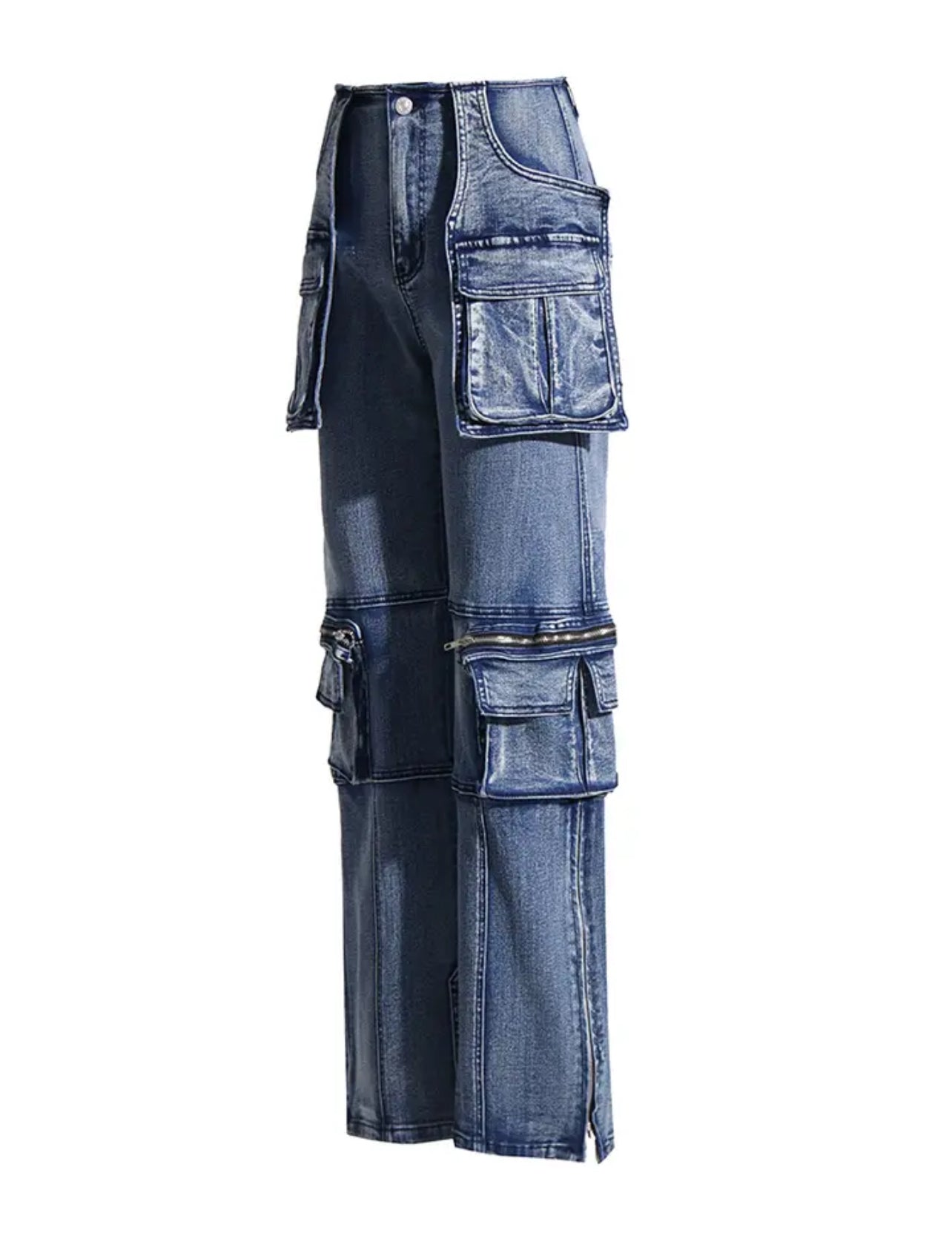 Unique baggy denim peach color cargo pants with multiple pockets and zippers with stretch
